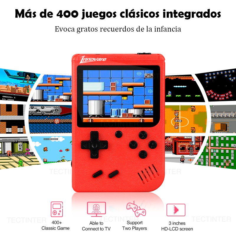 Lleva tus juegos clásicos favoritos contigo a donde vayas. La Consola Portátil Retro combina un diseño compacto y colorido con 400 juegos integrados, ideales para disfrutar en casa, de viaje o en cualquier momento libre.